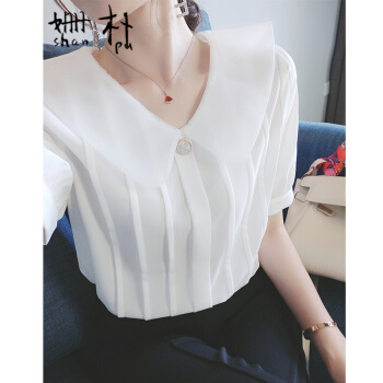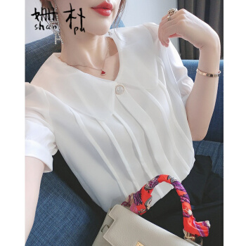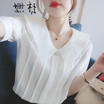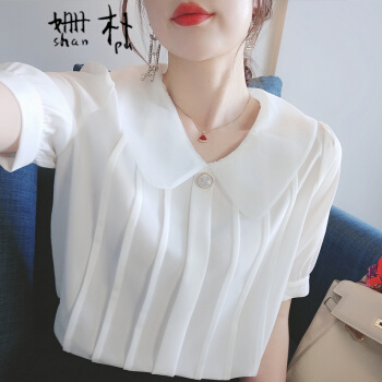 姗朴 雪纺衫女短袖娃娃领衬衫女韩版2020夏季新款女装仙气淑女百搭上衣洋气小衫超仙白色休闲时尚衬衫女 白色 L |
