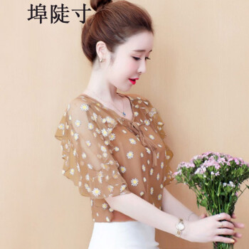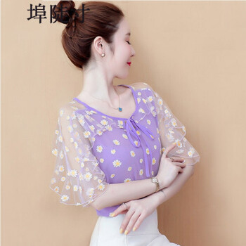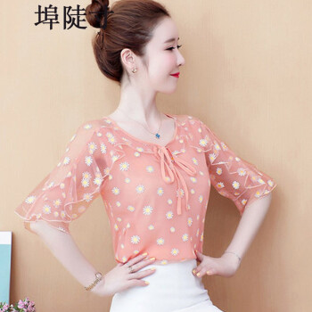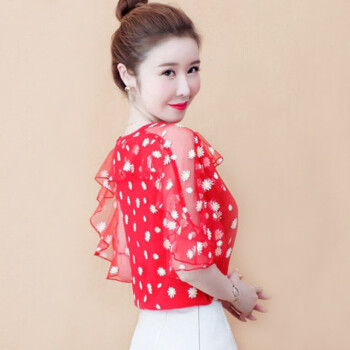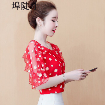 雪纺衫女埠陡寸2020夏季新品宽松显瘦蝴蝶结印花系带荷叶袖短袖上衣女 红色 S【80-95】 |