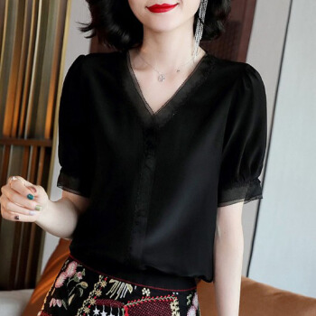雪纺衫女短袖2020夏季新款女装韩版衬衫时尚设计感小众V领衬衣气质套头上衣潮 黑色 XXL |