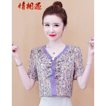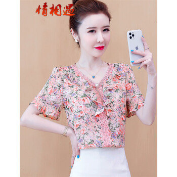 情相遇 雪纺衫女短袖2020夏季新款韩版时尚V领荷叶边碎花百搭上衣宽松显瘦遮肚气质小衫 粉色 L |
