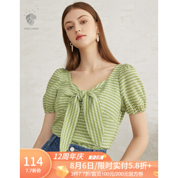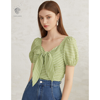 范思蓝恩 2020夏季新款复古泡泡袖雪纺衫女设计感小众胸前绑带上衣 青格纹 L |