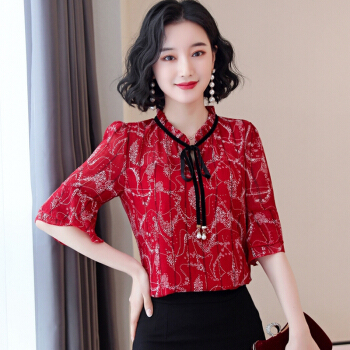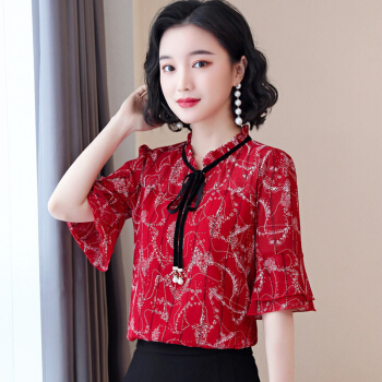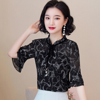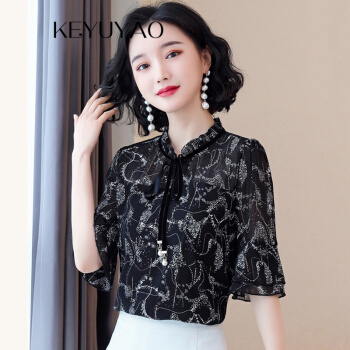 KEYUYAO轻奢高端女装 碎花雪纺衬衫女2020年新款夏季短袖上衣洋气遮肚蕾丝配裙子小衫 黑色 M |