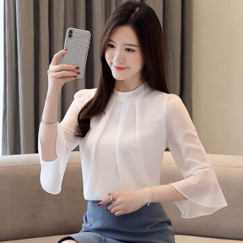 潘歌雪纺衬衫女2020新款女装夏季韩版白色淑女气质纯色宽松五分袖打底衫上衣女R339 白色 S |