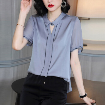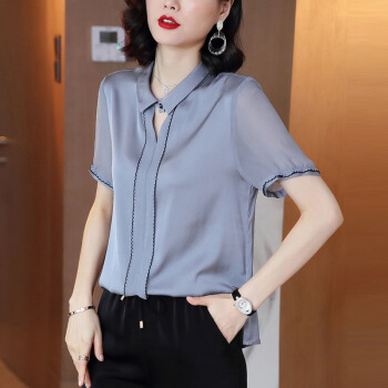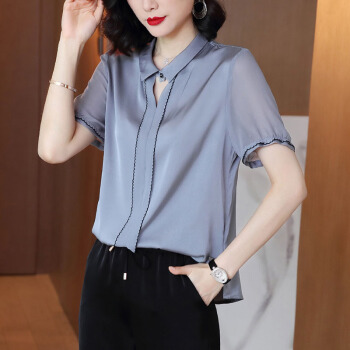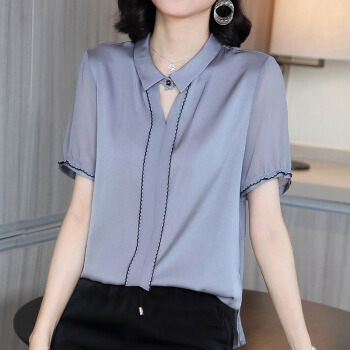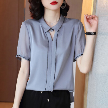 依语幽香休闲衬衫女装2020夏季新款短袖通勤衬衣百搭上衣缎面纯色 浅灰色 L |