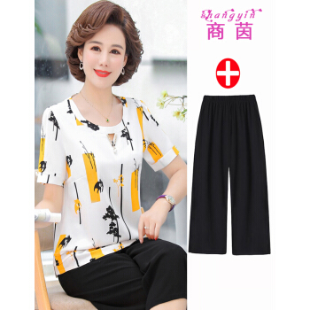 商茵SY中老年女装妈妈装2020年新款夏装短袖衬衫减龄洋气雪纺衫中年人t恤中老年女装上衣+裤子套装 粉红色+阔腿裤 2XL【建议105-120斤】 |