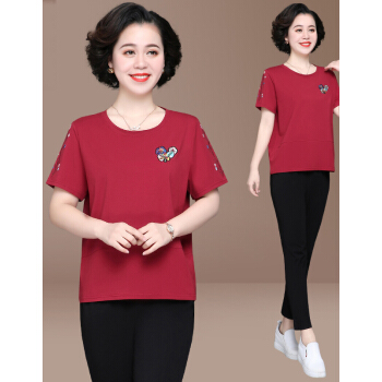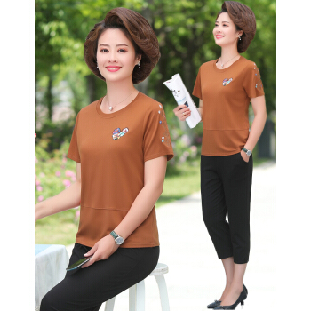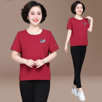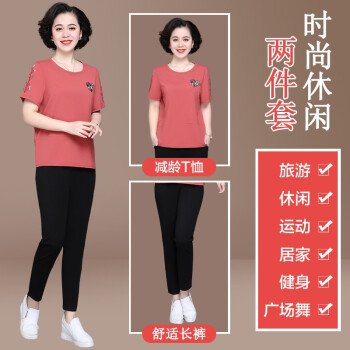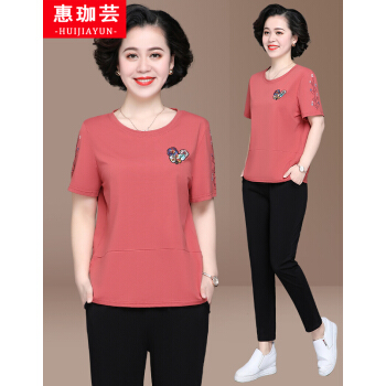 惠珈芸中老年女装夏装两件套短袖T恤上衣洋气2020新款简约时尚减龄阔太太运动装女大码宽松妈妈装套装 皮红色(7分裤) 此码勿拍.请拍自身对应码数 |