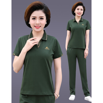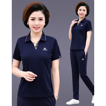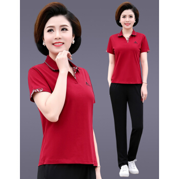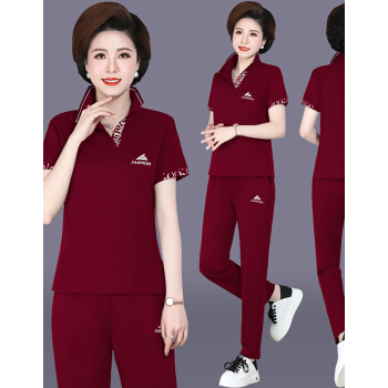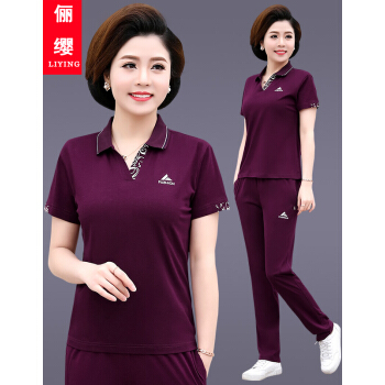 俪缨中老年女装2020夏装新款4050岁中年运动套装T恤上衣裤子女装休闲宽松大码妈妈装两件套女装 紫红色 L(105-115斤) |