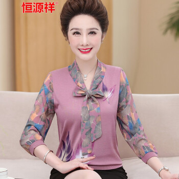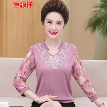 恒源祥中老年女装妈妈装长袖t恤女士针织2020秋季新款中年大码圆领纱袖上衣九分袖老年人奶奶装打底衫 7220浅紫 xL建议110--125斤 |