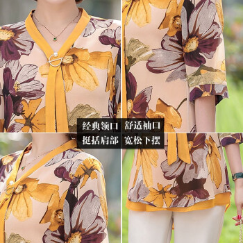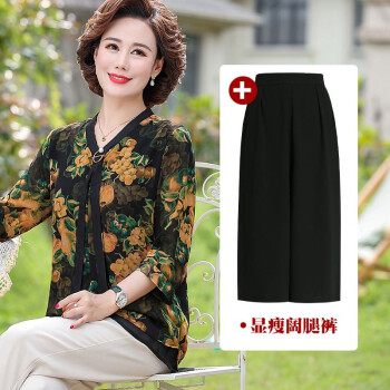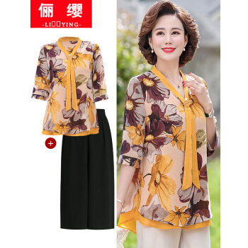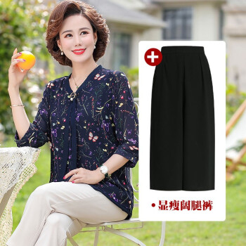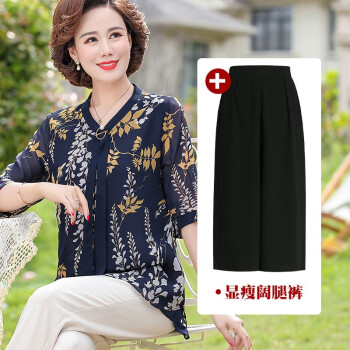 俪缨中老年女装夏装休闲套装女短袖上衣2020新款洋气4050岁中年妇女雪纺衫两件套阔太太妈妈装小衫 1号色+阔腿裤 2XL(建议105-120斤穿) |