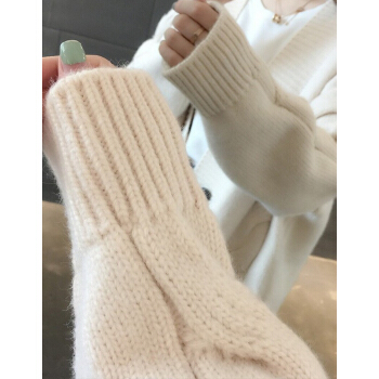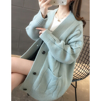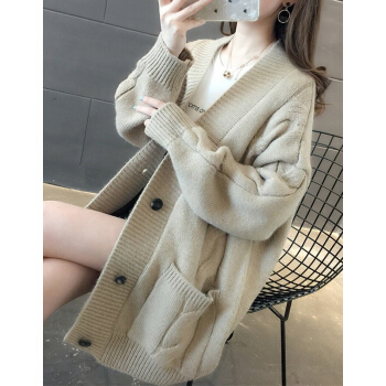 婪澈长袖针织衫女2020春秋新款女装韩版慵懒风V领中长款麻花针织衫宽松女开衫百搭毛衣外套 米白色 L |