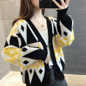 恒源祥针织衫女2020春秋季新款设计感小众短款菱格开衫毛衣女气质小香风长袖V领上衣女4644 黄色 M |