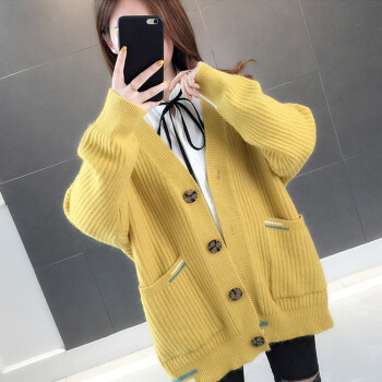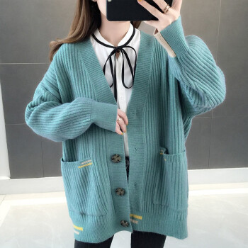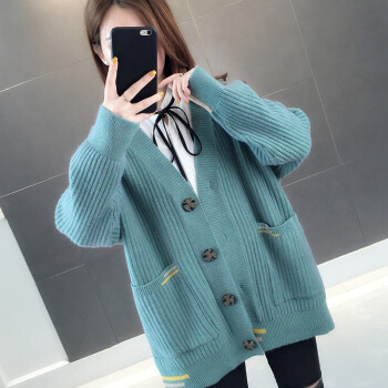 红蜻蜓 针织开衫毛衣女2020新款春秋韩版百搭宽松慵懒风外套时尚针织外搭上衣 WL738 绿蓝 均码 |