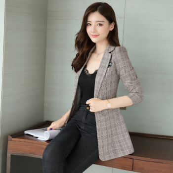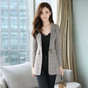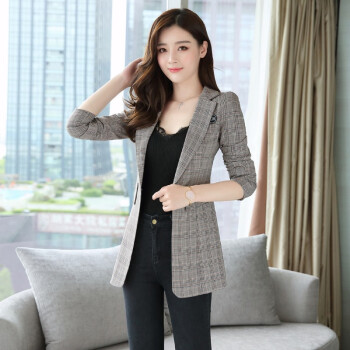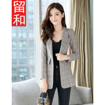 留和 小西装女2020年秋季韩版新款一粒扣格子百搭职业女装正装收腰女士上衣外套女X1187 卡其色 L |