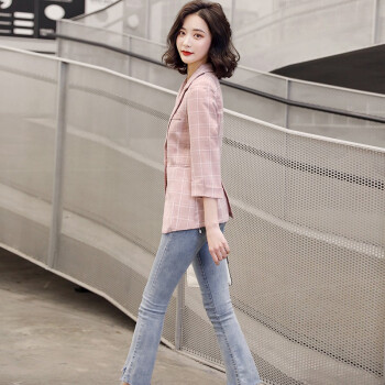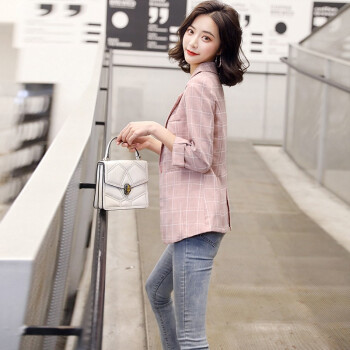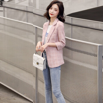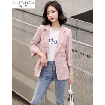 简草 小西装女2020秋季新款时尚韩版气质百搭修身休闲格子一粒扣单层小西服短外套女X8012 粉色 2XL |