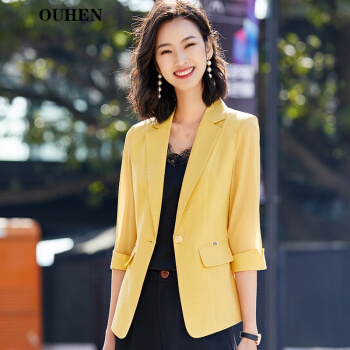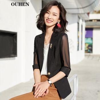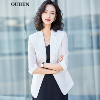 OUHEN轻奢品牌女装小西装外套女2020夏季新款薄款白色七分袖韩版休闲网纱拼接西服女上衣 白色中袖西装 L(建议96-105斤) |