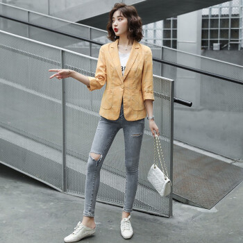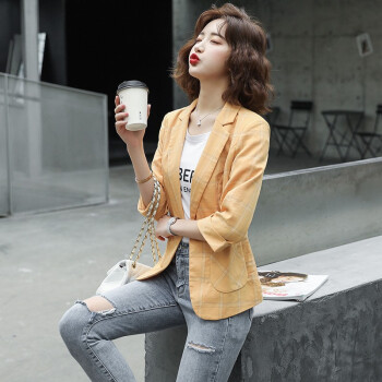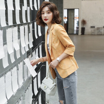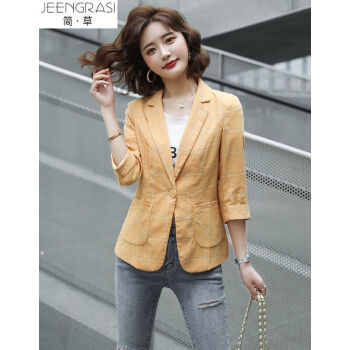 简草 小西装女2020秋装新款韩版时尚通勤简约气质百搭潮流格纹一粒扣七分袖西服外套女X8988 黄色 XL |