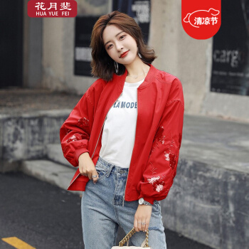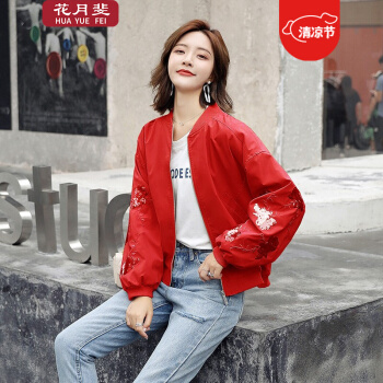 花月斐刺绣短外套女2020新款韩版宽松亮片棒球衫简约显瘦女士外套1992 红色 L |