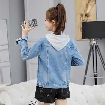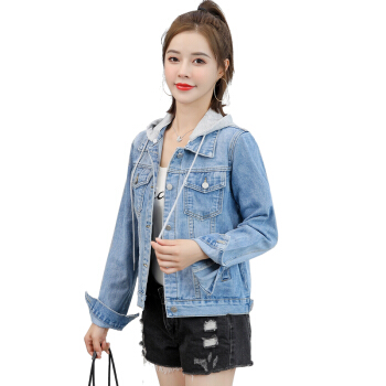韩诗茵牛仔外套女春秋新款长袖韩版宽松短款休闲连帽牛仔上衣百搭夹克 蓝色 L |