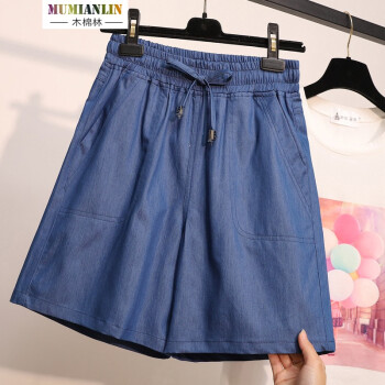 木棉林加肥加大码女装2020夏装新款冰丝五分大码牛仔短裤松紧腰薄宽松阔腿清凉胖MM热裤HYA47 蓝色 5XL(建议160-200斤) |