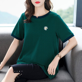 木棉林胖妹妹mm宽松t恤女韩版加大码女装2020新款夏装200斤显瘦条纹中长款洋气上衣L202733 蓝底绿条 3XL建议160-180斤 |