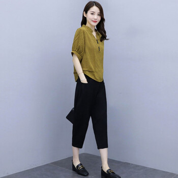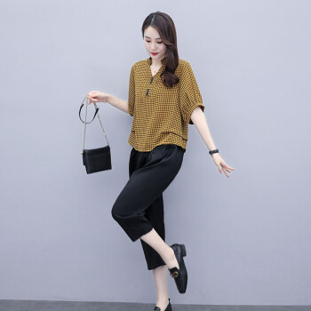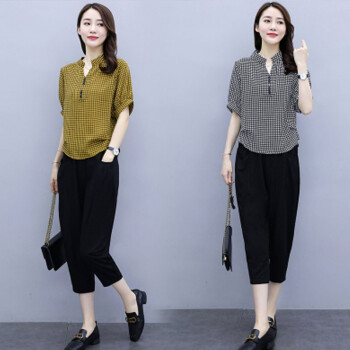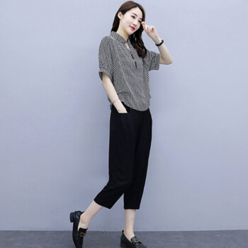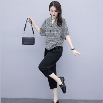 卿依瑟 大码女装棉麻套装女2020年夏季修身显瘦V领格子时尚上衣七分休闲裤俩件套装女潮 黑色 M |