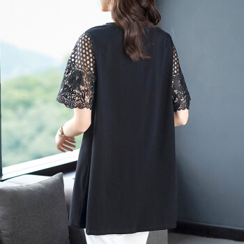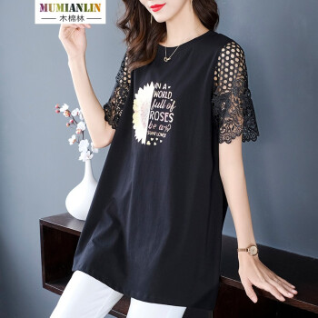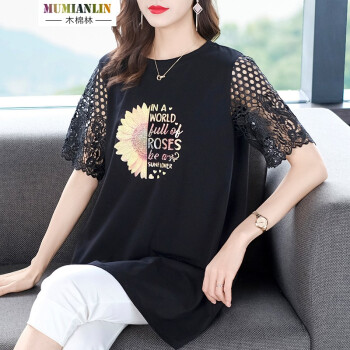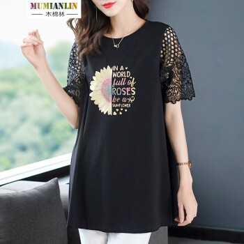 木棉林高端大码女装2020新款夏装胖妹妹mm减龄镂空拼接洋气印花中长款宽松显瘦T恤女L202797 黑色 2XL建议140-160斤 |