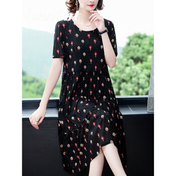 Cosstot轻奢品牌女装 大码高端连衣裙2020新款夏季中年妈妈贵夫人名媛气质遮肚裙子 黑色小树 XL |
