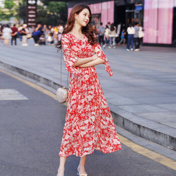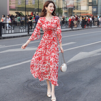 若玲珑网红碎花雪纺连衣裙2020新款夏收腰显瘦荷叶边气质小清新甜美超仙长裙 红花 M(建议90-105斤) |