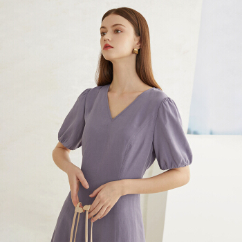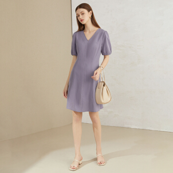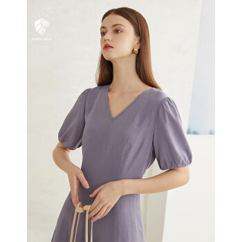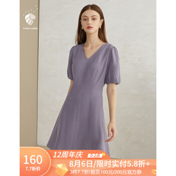 范思蓝恩 2020新款夏季泡泡袖V领连衣裙收腰显瘦气质女神范a字裙 紫色 L |