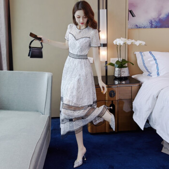 巷前 连衣裙2020新款夏季女装名媛仙女超仙蕾丝网纱收腰显瘦显高气质连衣裙子中长款 白色 M |