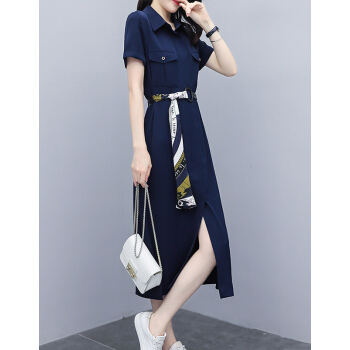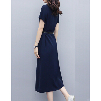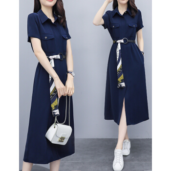 莱倪晟纳短袖连衣裙女装2020夏装新款韩版修身气质系带高腰显瘦开叉减龄中长裙潮 藏青色 请拍正确尺码 |