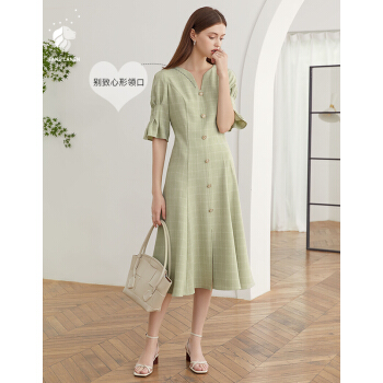 范思蓝恩 2020夏新款泡泡袖V领格子连衣裙女天法式复古约会小裙子 绿白格 S |