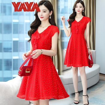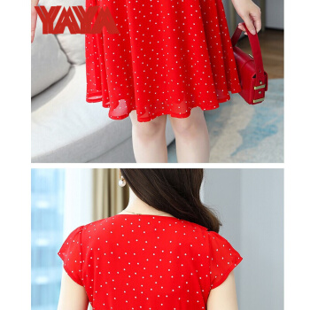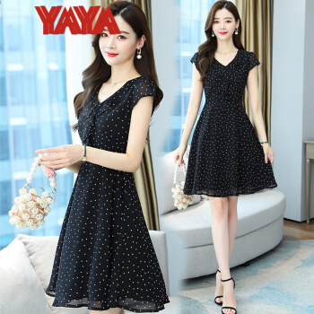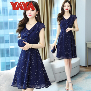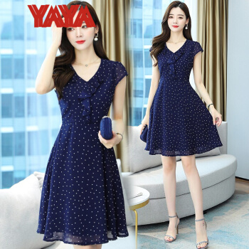 鸭鸭服饰(yaya)波点雪纺连衣裙女2020年女装夏季新款v领短袖荷叶边气质裙子女夏 蓝色 请选择正确尺码 |