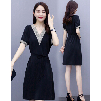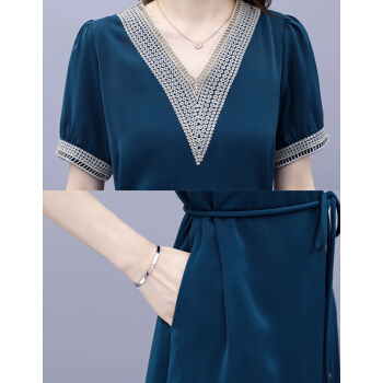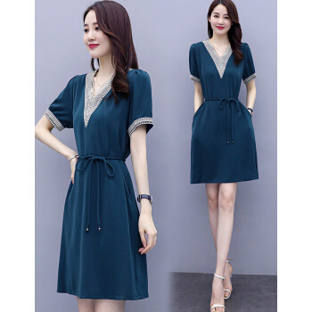 婪澈连衣裙女中长款2020女装夏季蕾丝镂空v领气质新款流行短袖显瘦透气裙子 蓝色 请下正确尺码 |