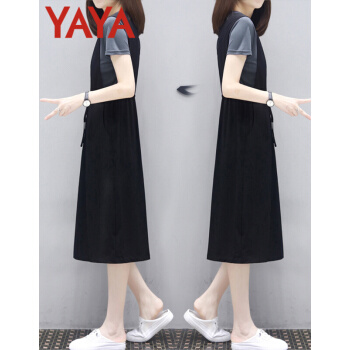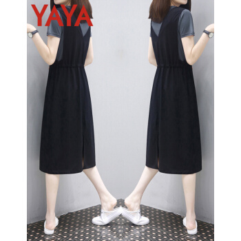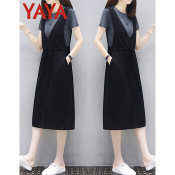 鸭鸭服饰(yaya)休闲连衣裙女2020年女装夏季新款流行韩版收腰显瘦两件套中长款T恤裙 灰T+黑裙 请选择正确尺码 |